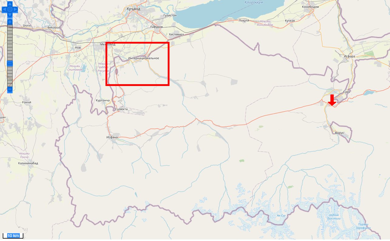 Стрелкой на карте обозначено село Кок-Таш в Баткенском районе. Оно находится у самой границы, на пути к таджикскому анклаву Ворух. Это село подверглось атаке в первый же день конфликта. В Баткенском районе сожгли дома, автозаправки и магазины. В этом районе также пострадали села Кок-Терек, Кызыл-Бел, Ак-Сай, Уч-Добо.