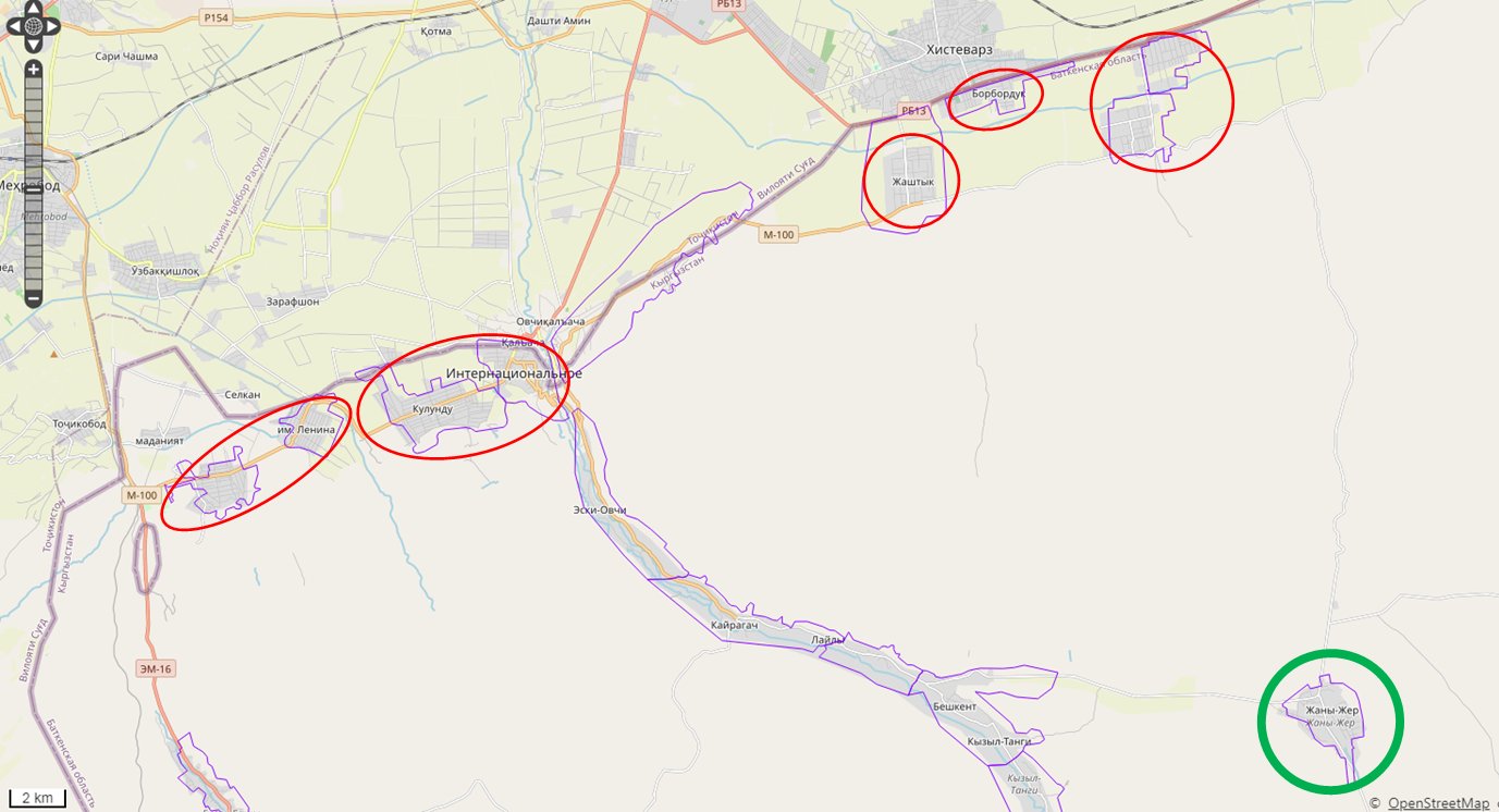 Зеленым отмечено село Жаны-Жер, куда сначала эвакуировали жителей Лейлекского района. Однако позже людей вывезли и оттуда. Сейчас сельчане эвакуированы в села Маргун и Дархум, а также в Исфану, Баткен и Сулюкту.