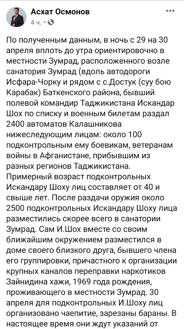 К конфликту на кыргызско-таджикской границе может быть причастен бывший полевой командир Шох Искандаров. Информацию об этом накануне на своей странице в Facebook опубликовал советник мэра Бишкека Асхат Осмонов.