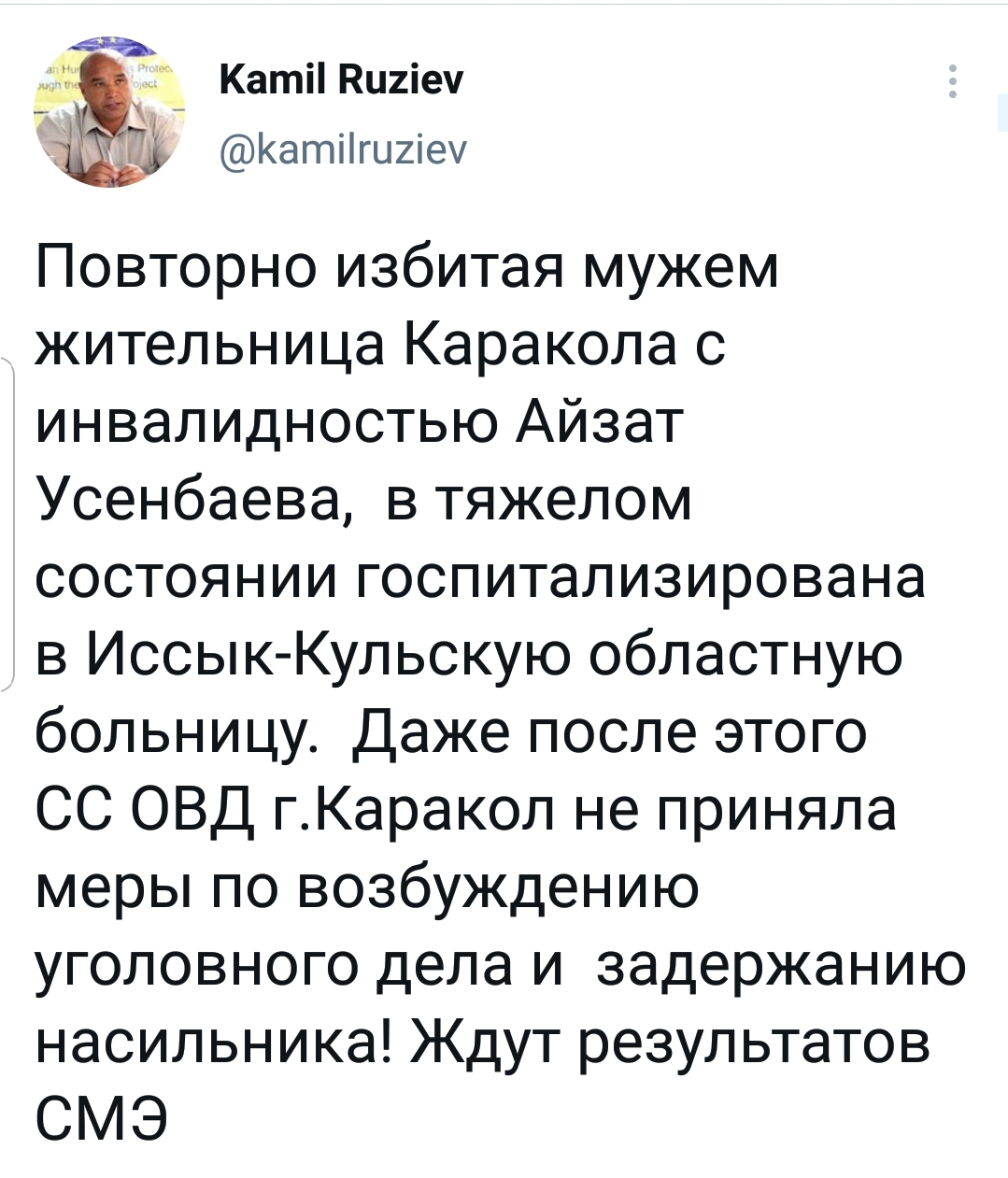 Правозащитник Камиль Рузиев написал в Twitter об избиении в Караколе женщины с инвалидностью Айзат Усенбаевой.