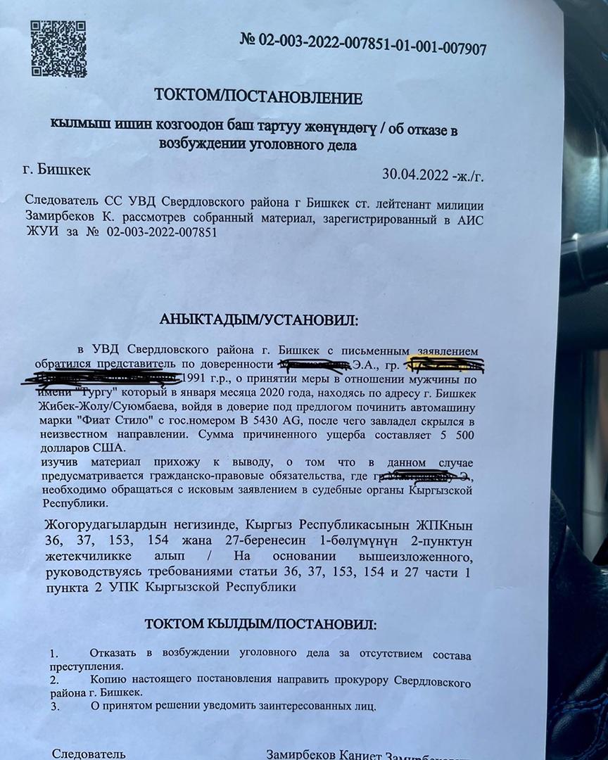 «Эта машина нужна моему клиенту, чтобы возить сына с ДЦП на физлечение в Бишкек. Они живут в сельской местности и без авто передвигаться невозможно. На этот автомобиль запчастей нет. Поэтому мастер по имени Тургун предложил потерпевшему найти Volkswagen Golf III и переставить мотор. Мужчина согласился и нашел машину. Ее и сломанный Fiat отвез к мастеру. Однако последний сказал, что работа сложная и нужно прийти через две недели, потом через месяц. После ремонтник скрылся с автомобилями. Написали заявление в УВД Свердловского района, подозреваемого нашли и доставили в милицию. Но его допросили без нашего участия и отказались возбудить уголовное дело за отсутствием состава преступления», — рассказал Шердор Абдыкапаров.