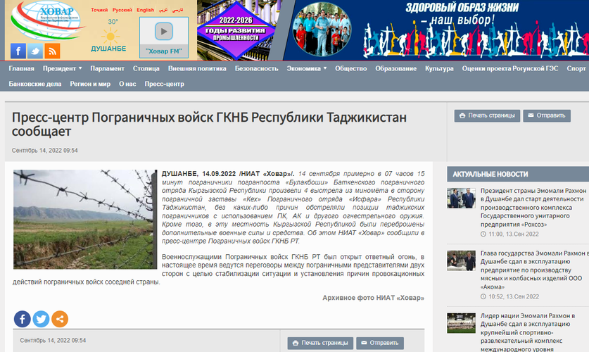 В Погранвойсках ГКНБ Таджикистана прокомментировали перестрелку, произошедшую между пограничниками двух стран на границе в Баткенской области. Версию ведомства опубликовало национальное информационное агентство «Ховар».