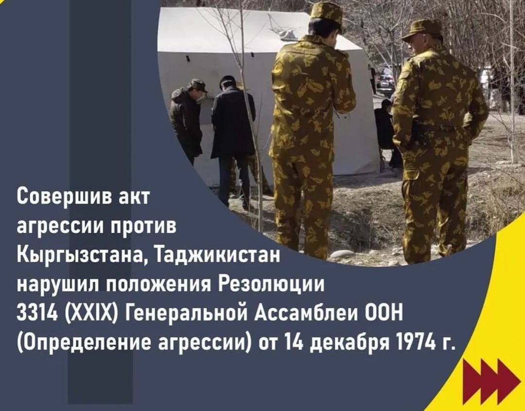 В социальных сетях распространяют информацию о том, какие нормы проигнорировал Таджикистан, начав стрельбу по селам и погранзаставам Кыргызстана. В частности, нарушены основополагающие принципы ООН и резолюция 3314 (определение агрессии) Генеральной ассамблеи ООН, а также основные нормы гуманитарного права.