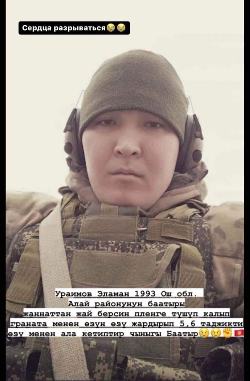 Также стало известно о подвиге 29-летнего Эламана Ураимова. Попав в окружение, он подорвал себя гранатой и унес с собой жизни 5-6 таджиков. Ранее сообщалось о гибели жителя села Кулунду Лейлекского района Алишера Набиева. Погибший служил контрактником в Пограничной службе ГКНБ Кыргызстана.В ходе конфликта на кыргызско-таджикской границе погиб младший сержант Внутренних войск Манас Баатырбеков. Он получил смертельные ранения от осколков снаряда во время обстрела на участке водозабора «Головной» близ села Аксай. Манасу Баатырбекову было 27 лет. На начало октября у него была запланирована свадьба.