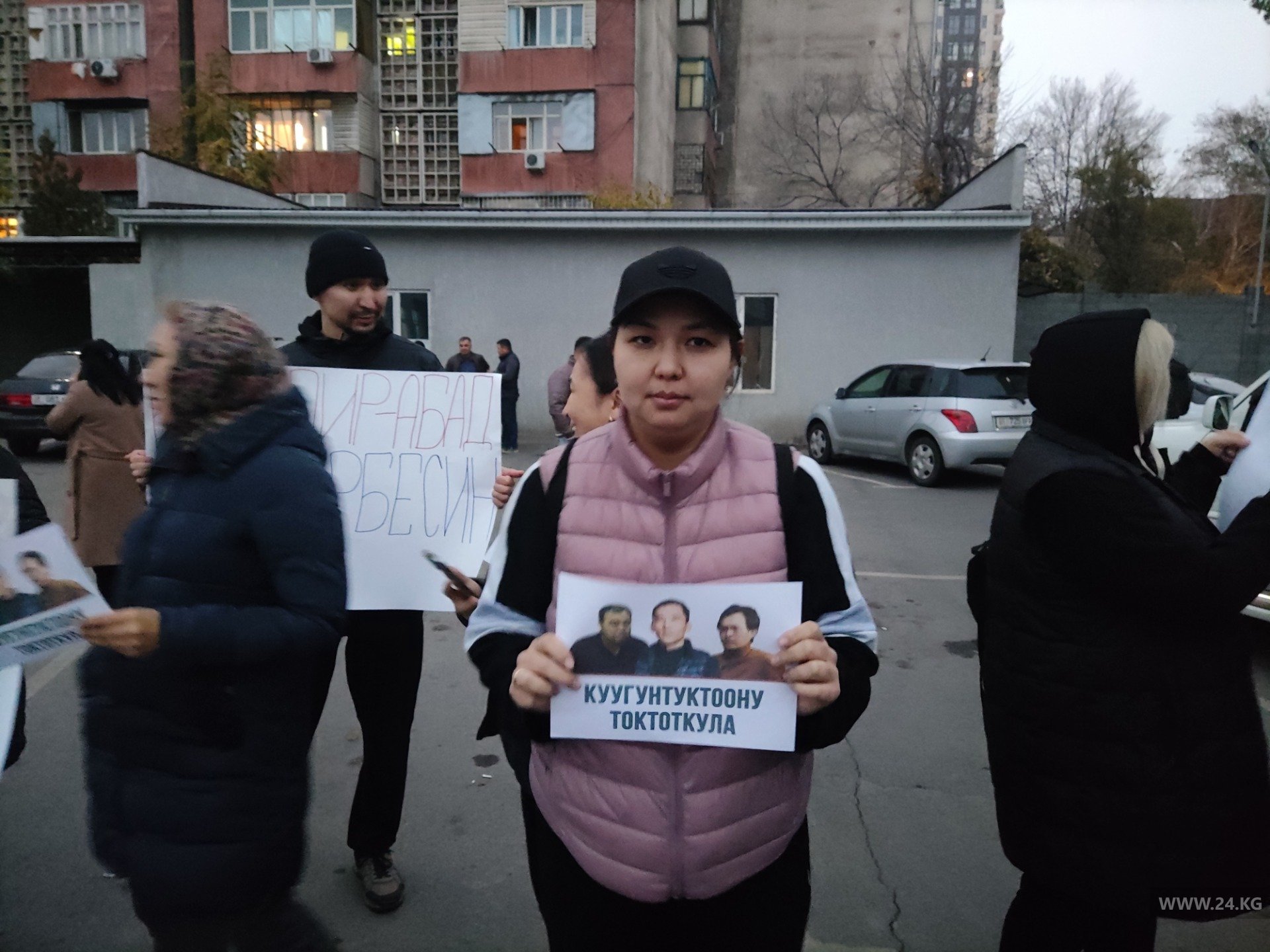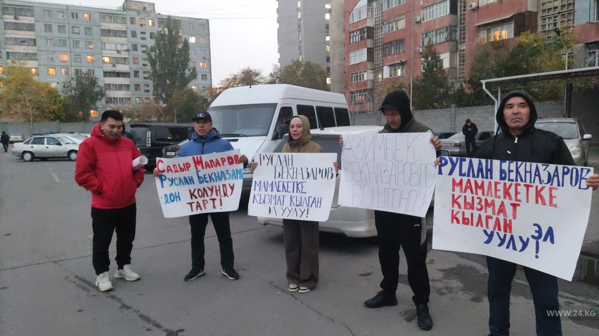 На плакатах написано: «Садыр Жапаров, прекрати политические гонения», «Свободу Бекназаровым — сыну и отцу».