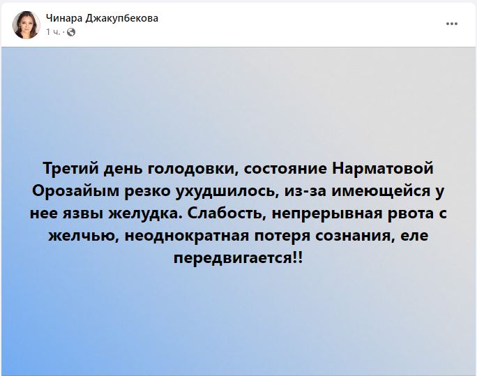 Как отметила адвокат, у Орозайым Нарматовой началось обострение язвы желудка. «Слабость. непрерывная рвота с желчью, неоднократная потеря сознания, еле передвигается», — написала о состоянии своей подзащитной Чинара Джакупбекова.
