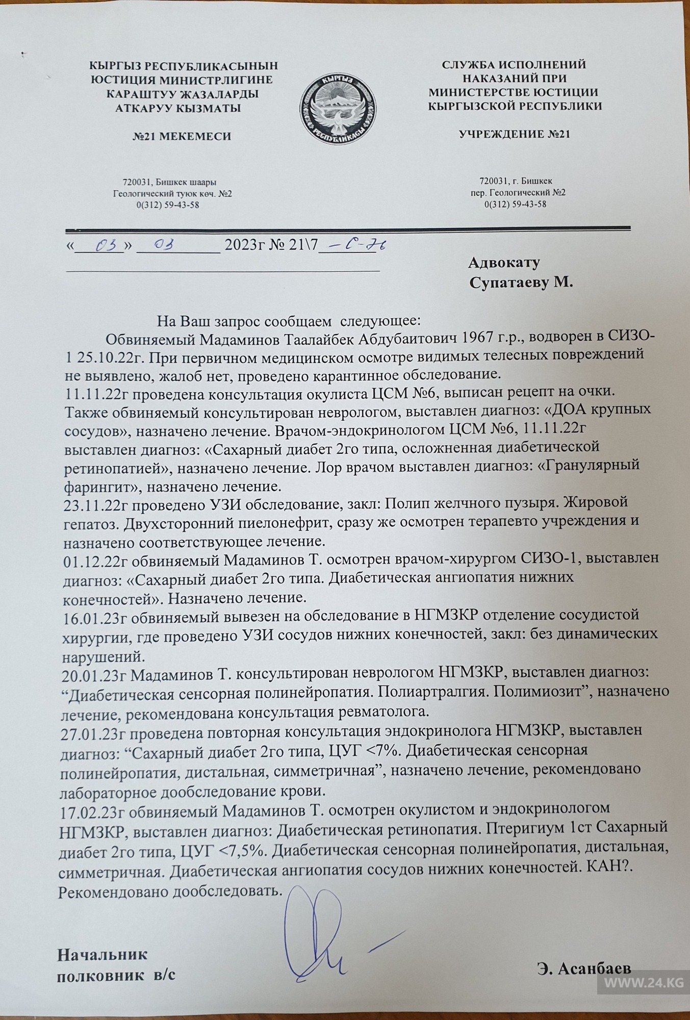 «В частности, у Таалайбека Мадеминова сахарный диабет второго типа и ретинопатия. Из СИЗО-1 Бишкека моего подзащитного вывозили несколько раз на обследование в гражданскую клинику. Болезни, которыми страдает Мадеминов, подпадают под перечень заболеваний, с которыми нельзя содержать обвиняемого под стражей. Несмотря на это, судебная коллегия оставила в силе решение первой инстанции», — сказал юрист.