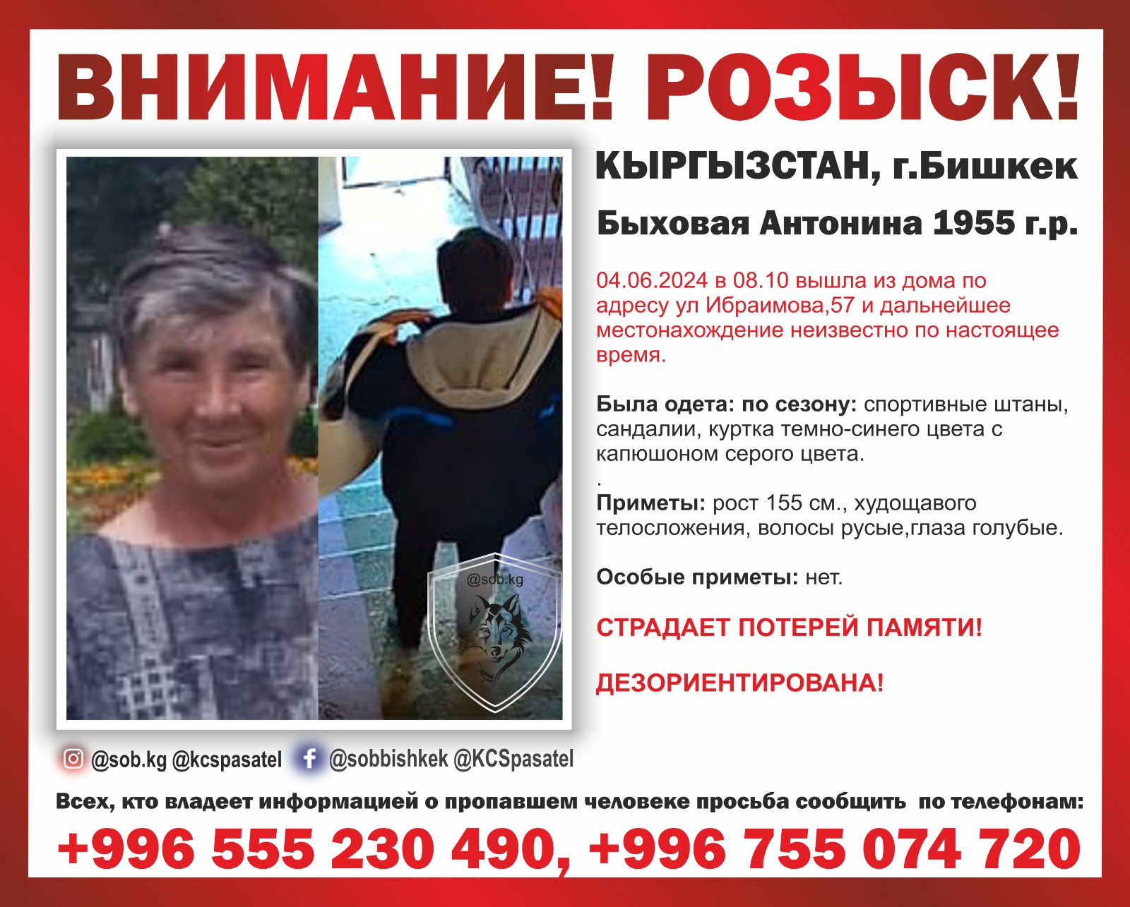 Женщина вышла из дома на улице Ибраимова 4 июня примерно в 08.10 и не вернулась. Страдает потерей памяти, дезориентирована.
