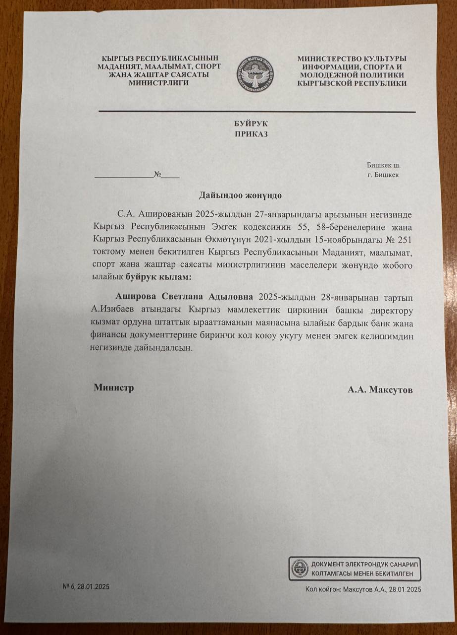Напомним, Светлану Аширову назначили директором цирка в конце октября 2024 года, а 23 января 2025-го пресс-служба Министерства культуры КР сообщила, что по истечении испытательного срока ее освободили от занимаемой должности. Обратившиеся в редакцию артисты заверили, что Светлана Аширова, несмотря на заявление Минкульта, не покидает свой кабинет.