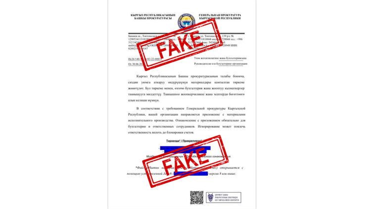 В последние дни некоторые граждане получают фейковые сообщения по электронной почте и через мессенджеры следующего содержания: «В соответствии с требованиям Генеральной прокуратуры Кыргызской Республики вашей организации направляется приложение с материалами исполнительного производства. Ознакомление с приложением обязательно для бухгалтерии и ответственных сотрудников».