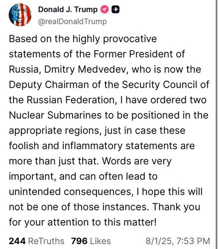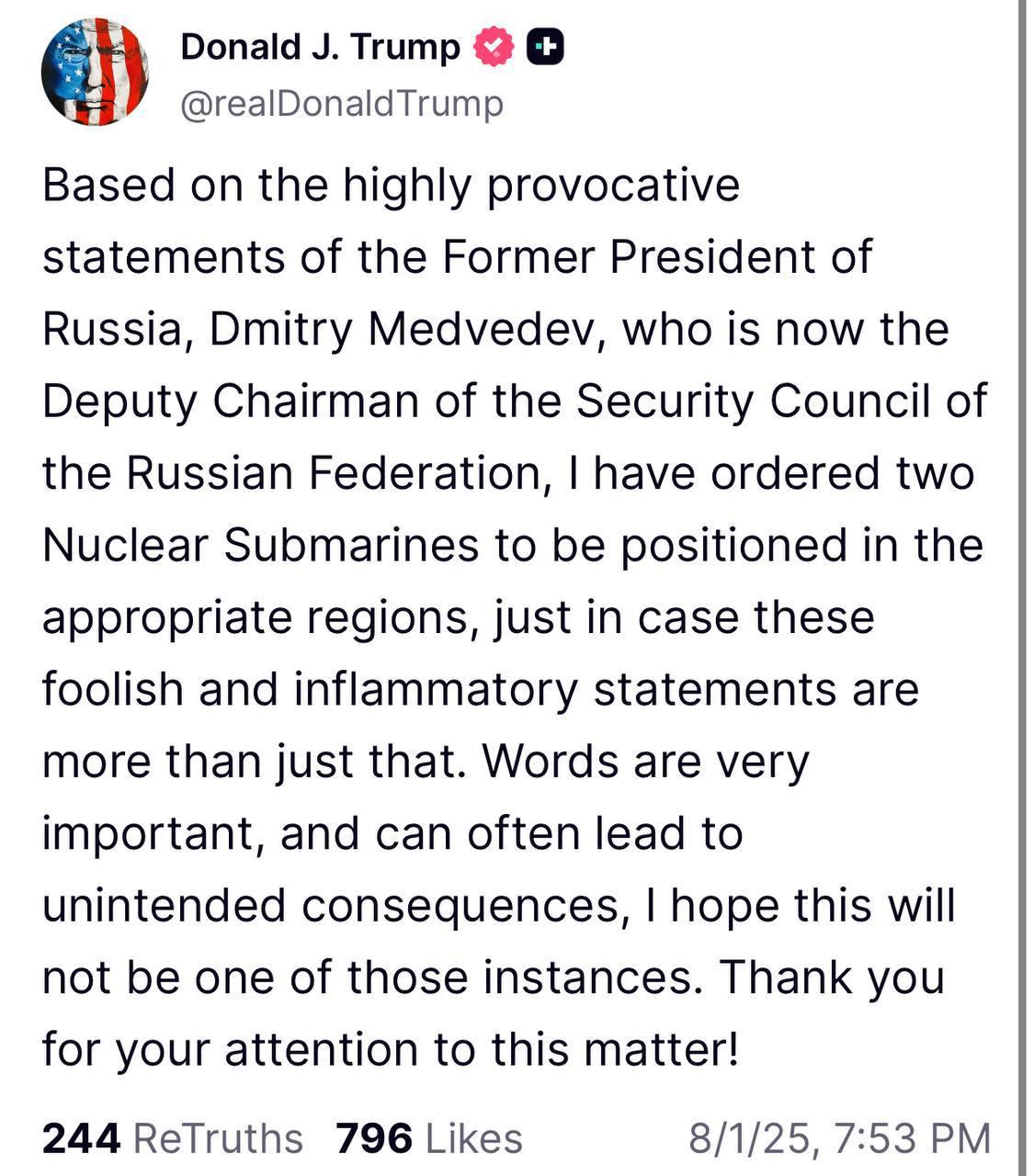 «На фоне крайне провокационных заявлений бывшего президента РФ Дмитрия Медведева, который сейчас занимает пост заместителя председателя Совета безопасности России, я отдал приказ разместить две атомные подводные лодки в соответствующих регионах на случай, если эти безрассудные и разжигающие высказывания окажутся не просто словами. Слова имеют большое значение и нередко приводят к непредвиденным последствиям. Надеюсь, в этот раз до этого не дойдет. Спасибо за внимание к этому вопросу», — написал он.