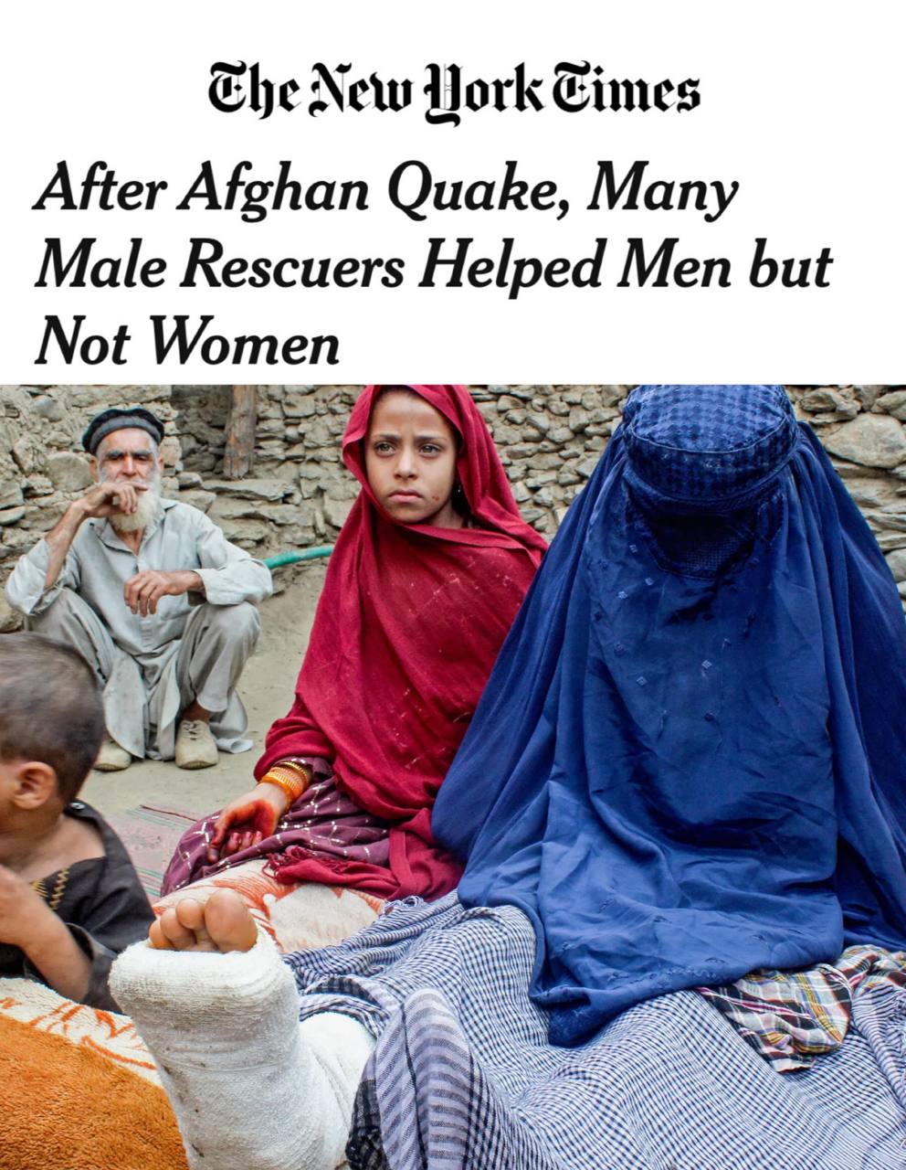 «Первые спасатели прибыли в деревню Биби Айша спустя более 36 часов после того, как землетрясение разрушило поселения в горных районах восточного Афганистана. Но вместо того, чтобы принести облегчение, их вид усилил страх: среди них не было ни одной женщины», — говорится в материале.