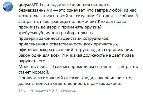 - «Если подобные действия остаются безнаказанными, это означает, что завтра любой из нас может оказаться в такой же ситуации. Сегодня — собака. А завтра что? Где границы полномочий?» — пишут в соцсетях.