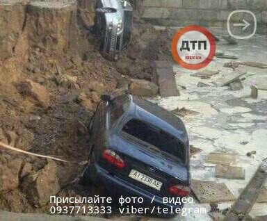 В Киеве (Украина) несколько автомобилей буквально провалились под асфальт из-за обвала грунта. Об этом сообщили на портале dtp.kiev.ua