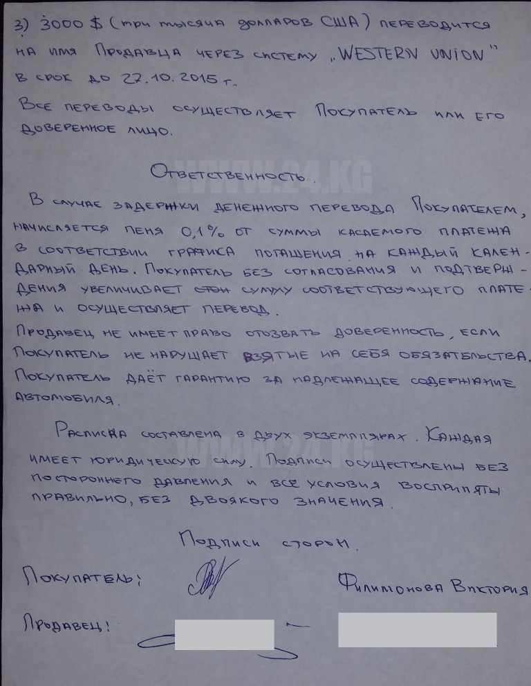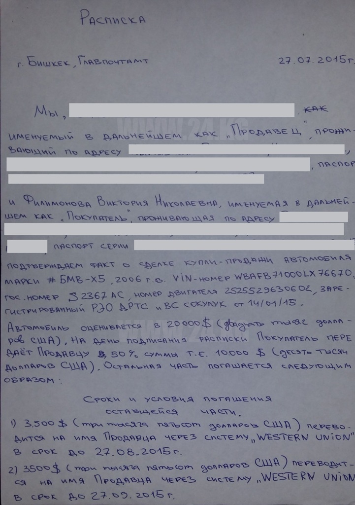 Несколько лет знакомая семейная пара продавала внедорожник BMW-X5. По тем временам машина стоила $17 тысяч. Покупатель нашелся, но без денег. Он предложил купить авто в рассрочку. Написал расписку и уехал на юг Кыргызстана. Закончилось все тем, что сотрудники правоохранительных органов посоветовали продавцам забыть о машине и деньгах и довольствоваться стареньким «Опелем», который удалось выручить от сделки.