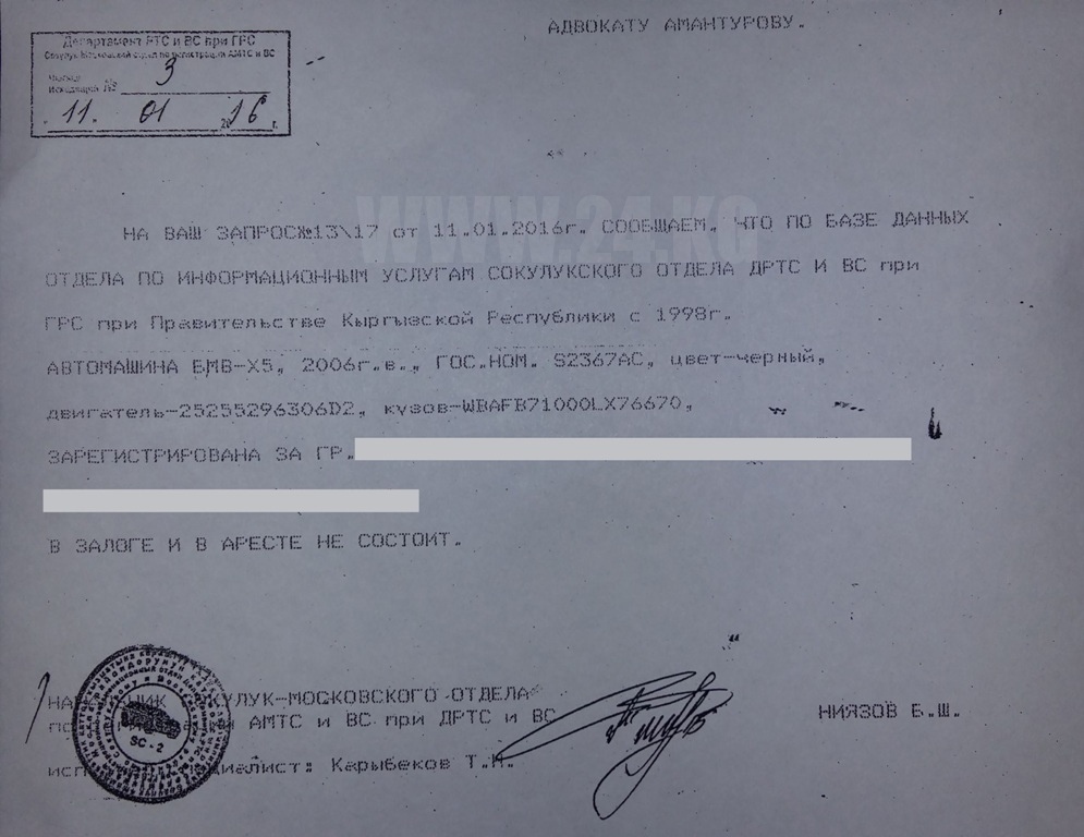 По данным Департамента регистрации транспортных средств и водительского состава по Сокулукскому району, BMW-X5 до сих пор принадлежит гражданину КР. Автомобиль не заложен и не арестован.