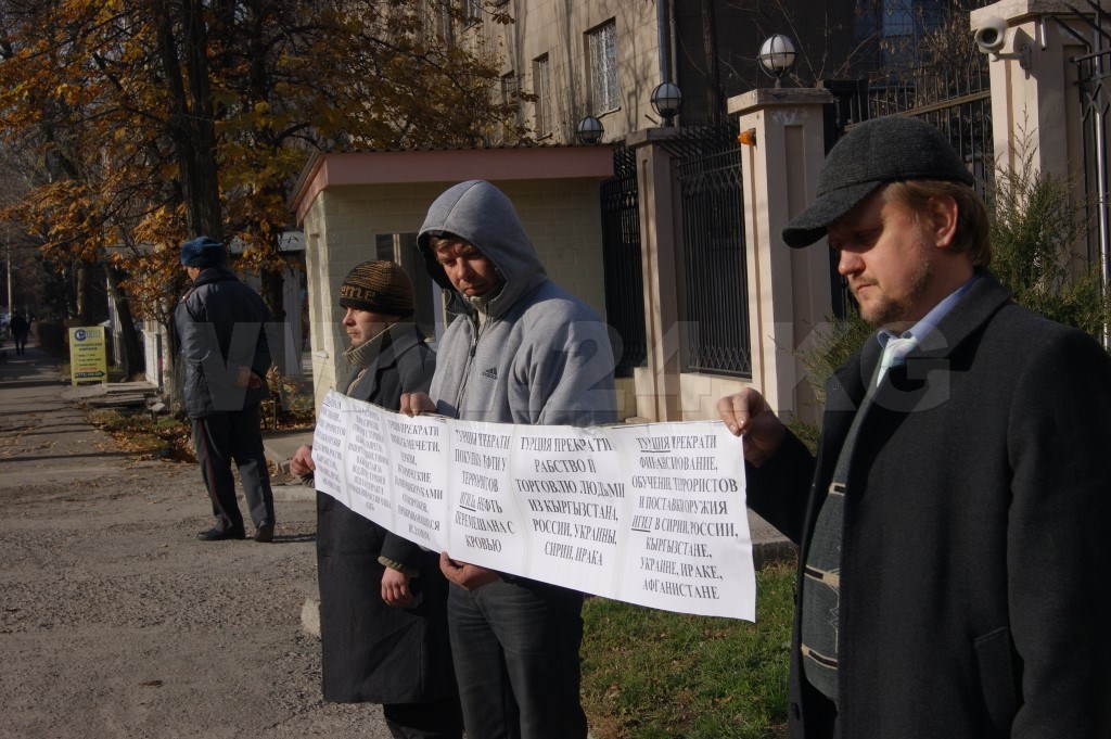 Возле посольства Турции в Бишкеке проходит митинг, участники которого требуют от этой страны прекратить сотрудничество с ИГИЛ.