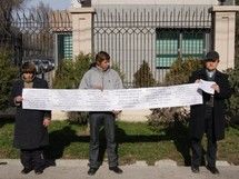 Участники акции развесили плакаты «Турция, прекрати финансирование, обучение террористов и поставки оружия ИГИЛ в Сирии, России, Кыргызстане, Украине, Ираке, Афганистане», «Турция, прекрати рабство и торговлю людьми из Кыргызстана, России, Украины, Сирии, Ирака» и другие.