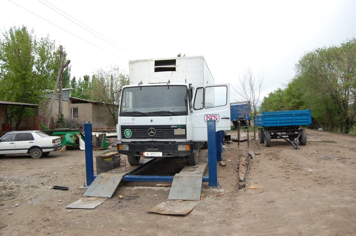 Другой предприимчивый сельчанин по имени Мухамбет организовал СТО для большегрузных автомобилей. Буквально в десяти шагах от канала несколько грузовиков на ремонте. Установлен подъемник.