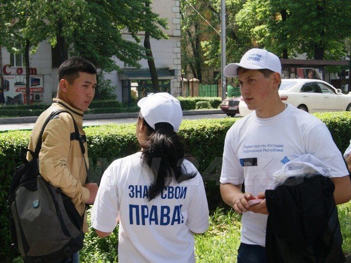 За пять дней до Дня Конституции Кыргызстана Министерство юстиции решило напомнить гражданам, проживающим на «островке демократии», что у них есть права. Молодые люди, в основном сотрудники самого ведомства и некоторых общественных организаций, прогулялись от кинотеатра «Россия» до Старой площади, раздавая по пути редким прохожим выдержки из статей отечественной Конституции, касающиеся прав и свобод. Презент оформлен в виде календаря.