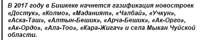 Как рассказал заместитель гендиректора по ремонту и капитальному строительству ОсОО «Газпром Кыргызстан» Мурат Сулайманов, до конца 2017 года запланировали провести газ в 22 жилмассива Бишкека и пять районов в Чуйской области.