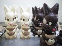 Сначала мастера красят детали изделия (глазки, шляпки, шарфики) в формочке пищевой краской. Затем скрепляют специальными скрепками спинку и мордашку животных, отправляют форму ненадолго в морозильник. Потом заполняют форму горячим шоколадом, и снова – в холодильник. После того как изделие застынет, форма должна немного оттаять, чтобы легко «освободить» фигурный шоколад. Стоит немного не соблюсти температурный режим, и заяц может не получиться.