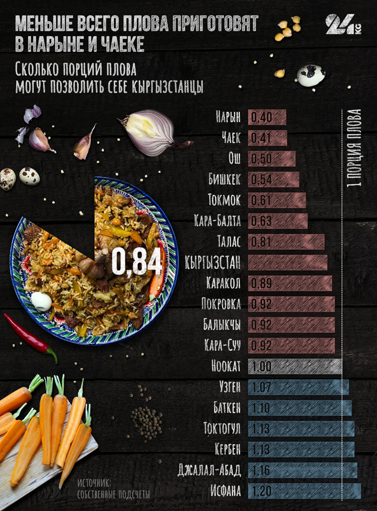 При этом больше всего плова могут приготовить жители Исфаны (1,2 порции) и Джалал-Абада (1,16 порции). А вот меньше всего плова доступно чаекцам и нарынчанам — меньше половины порции.