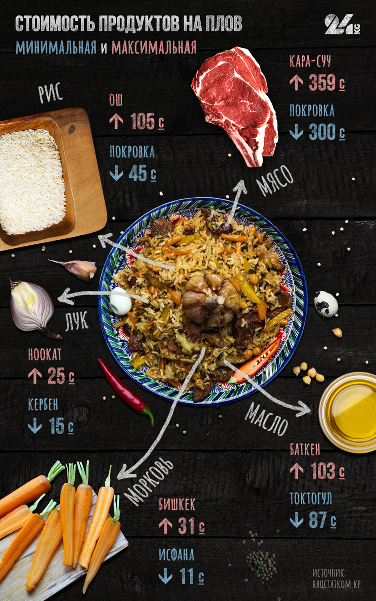 Плов входит в культурное наследие ЮНЕСКО. Это блюдо любят готовить не только в Кыргызстане, но и во всех центральноазиатских государствах, а также в странах, где много выходцев из региона. Мы решили посчитать, а сколько стоит порция плова у соседей.