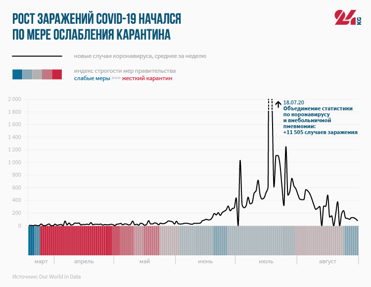 Результаты не заставили себя ждать — уже с начала июня начался стремительный рост числа зараженных коронавирусом и, как оказалось впоследствии, внебольничной пневмонией. В июне-июле, только по официальным сведениям, от последствий вируса скончались 1 тысяча 362 человека. Всего за это время у более 34 тысяч диагностирован коронавирус.