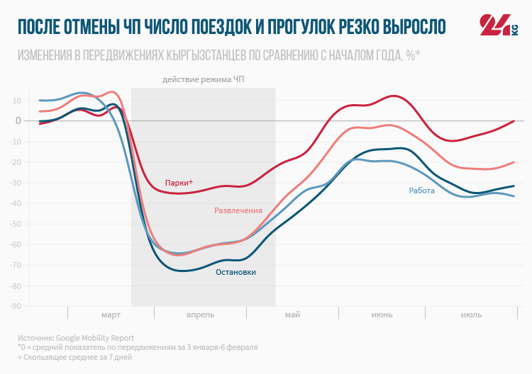 Данные Google о передвижении населения также говорят об отсутствии достаточной системы информирования граждан. С введением ЧП системы Google зафиксировали резкое падение передвижений по всей республике — от поездок на работу до отдыха в парках и торговых центрах. Именно поэтому случаев заражения в те дни было крайне мало. Но в середине мая, после снятия карантина, количество поездок и прогулок резко выросло, а вместе с ними (с учетом инкубационного периода) начали расти и случаи коронавируса.