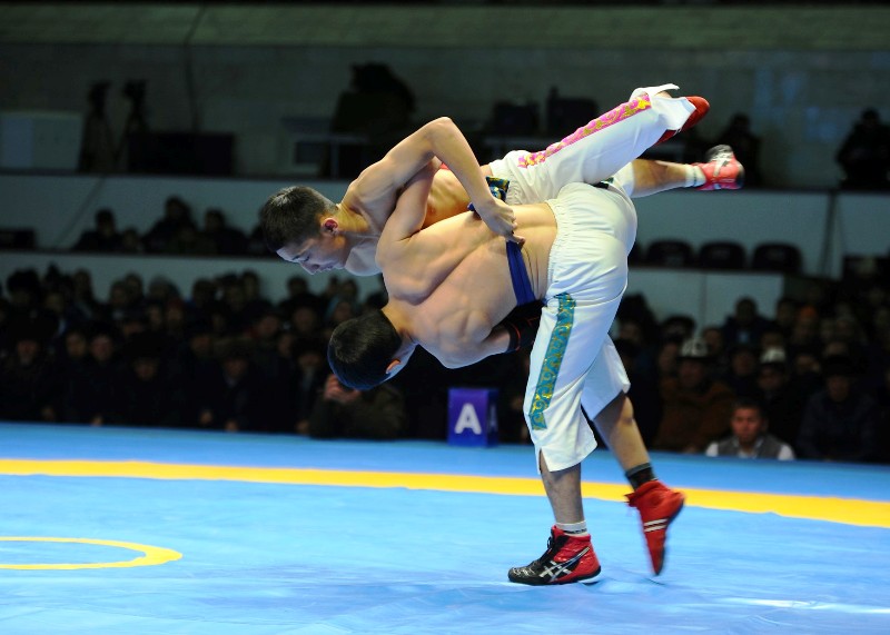 По правилам кыргыз куроша два спортсмена берут друг друга за пояс и пытаются повалить на ковер. Если соперник падает на живот или пятую точку, получаешь один балл, набок — два. Можно победить досрочно, бросив противника на лопатки, или доведя преимущество до восьми баллов. На все — четыре минуты чистого времени.