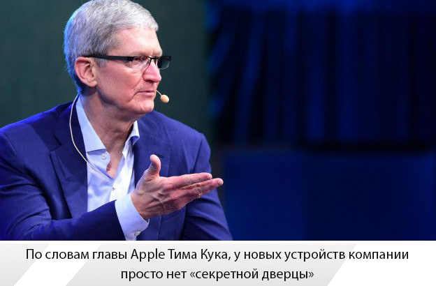 Для расшифровки данных на новых устройствах необходимо ввести специальный пароль, известный только пользователю данного телефона. Исполнительный директор Apple Тим Кук заявил, что компания не позволяет спецслужбам использовать «секретную дверцу» в своем программном обеспечении. «Мы считаем, что шифровка данных – это необходимое условие современного мира, - сказал Кук. – Никто не должен иметь право решать, где проходит граница между частной жизнью и интересами безопасности. Мы сами способны в этом разобраться».