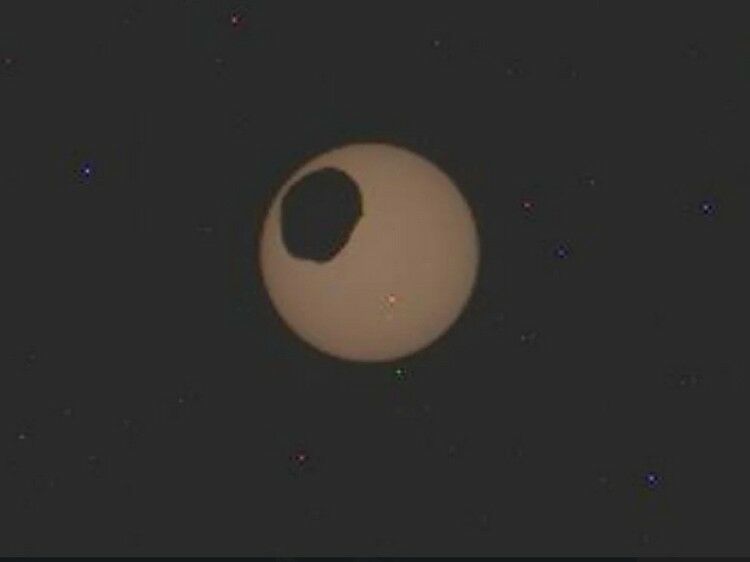 На кадрах виден Фобос — мини-луна Марса. По форме спутник напоминает большую картофелину. Он пролетел впереди Солнца, его темный силуэт отчетливо виднелся на светлом фоне звезды.