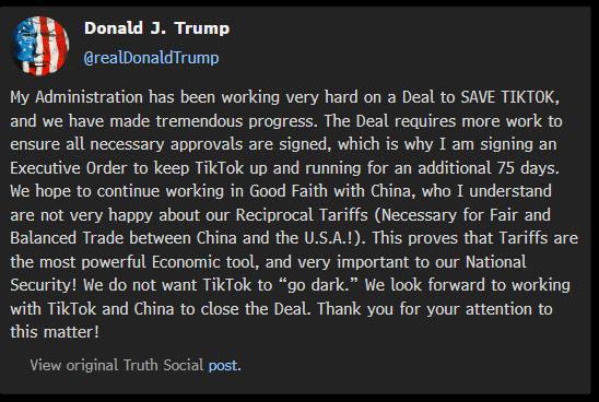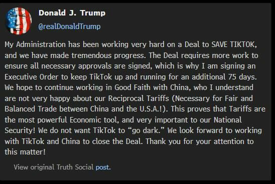 «Моя администрация очень усердно работает над сделкой по спасению TikTok, и мы добились огромного прогресса. Сделка требует дополнительной работы... Мы надеемся продолжить добросовестно работать с Китаем, который, как я понимаю, не очень доволен нашими взаимными пошлинами... Мы не хотим, чтобы TikTok «ушел в тень». Мы надеемся на сотрудничество с TikTok и КНР, чтобы заключить сделку», — написал Дональд Трамп в своей соцсети Truth Social.