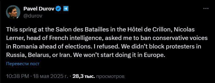 «Этой весной в «Зале сражений» отеля Hotel de Crillon глава французской разведки Николя Лернер попросил меня заблокировать консервативные голоса в Румынии перед выборами. Я отказался. Мы не блокировали протестующих в России, Беларуси или Иране — и не начнем делать это в Европе», — написал он.