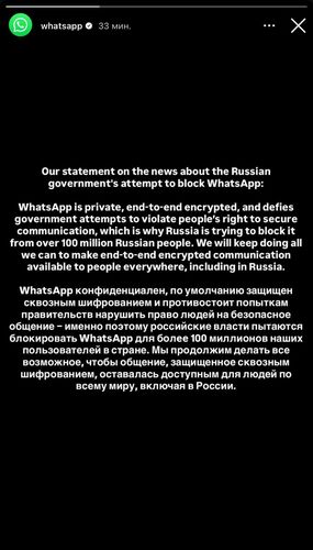 «WhatsApp конфиденциален, по умолчанию защищен сквозным шифрованием и противостоит попыткам правительств нарушить право людей на безопасное общение. Именно поэтому российские власти пытаются блокировать WhatsApp для болee 100 миллионов наших пользователей в стране. Мы продолжим делать все возможное, чтобы общение, защищенное сквозным шифрованием, оставалось доступным для людей по всему миру, включая РФ», — отметили в компании.