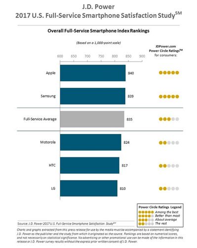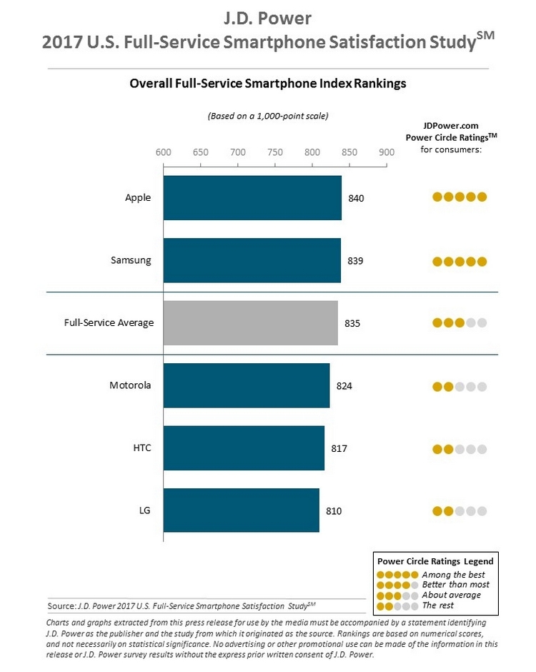 Новое исследование компании J. D. Power and Associates «2017 Full-Service Smartphone Satisfaction Study» показало, что владельцы iPhone более довольны им, чем владельцы смартфонов других брендов. Хотя телефоны Samsung отстали от iPhone всего на один балл.