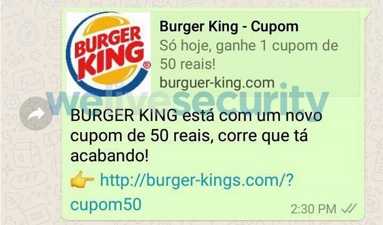 Как отмечается, мошенники распространяют через личные сообщения и группы сообщение об акции в «Бургер Кинге» с бесплатными купонами. К сообщению прикрепляют ссылку на розыгрыш. Для убедительности используют логотип компании и похожий адрес сайта. Поэтому многие могут не заметить обман.