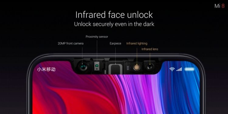 Xiaomi Mi 8 получил дизайн в духе всех актуальных устройств этого года, с вертикальной камерой и вырезом в верхней части дисплея. Экран Samsung AMOLED имеет размер 6,21 дюйма и соотношение сторон 18,7 : 9.В вырезе в дисплее, который получился внушительных размеров, компания расположила первый в истории Android-устройств модуль 3D сканирования лица.