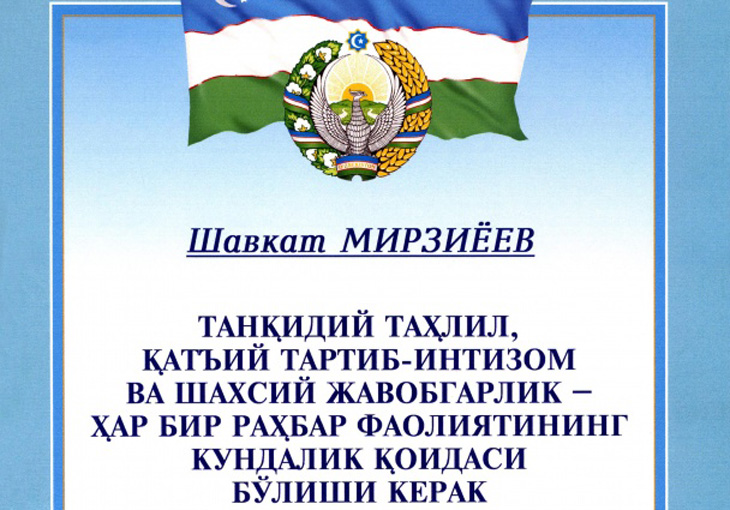 В Узбекистане издали первую книгу президента Шавката Мирзиеева «Критический анализ, жесткая дисциплина и персональная ответственность должны стать повседневной нормой в деятельности каждого руководителя». Об этом сообщило Uzdaily.Uz.