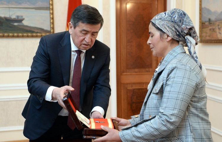 Медаль «Эрдик» супруге погибшего Равшана Муминова вручил президент Кыргызстана
