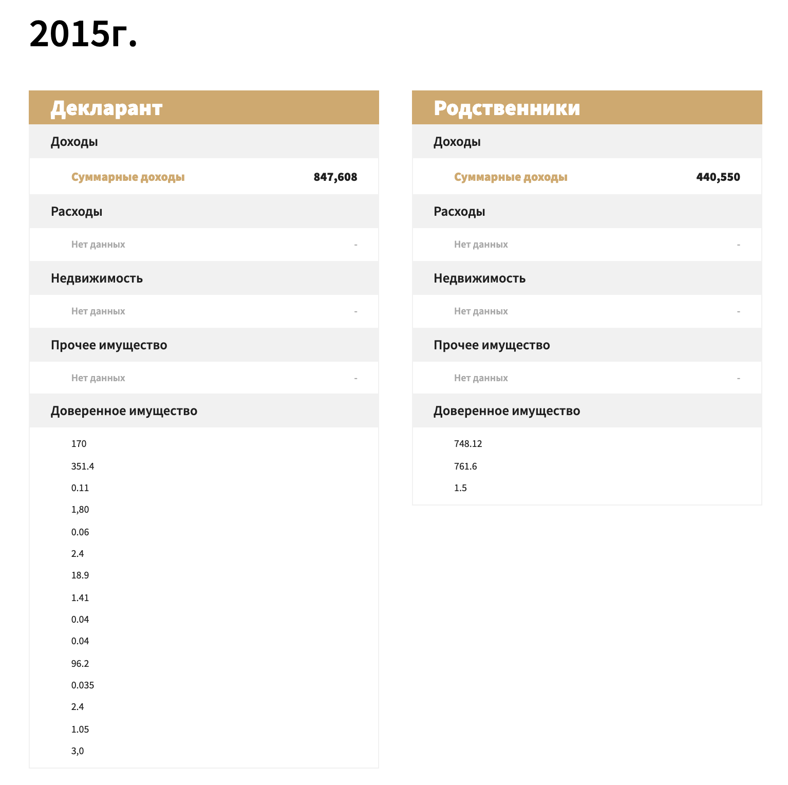 Близкий родственник дважды депутата заработал в тот год 440 тысяч 500 сомов. Его имущество ограничивается тремя земельными участками.