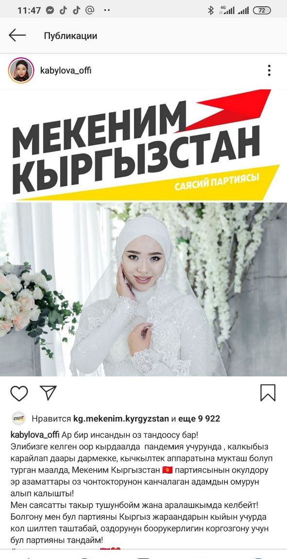 Я вообще не разбираюсь в политике и не хочу вмешиваться! Я выбираю эту партию, потому что в трудную минуту не оставили кыргызский народ без помощи!» — написала Кабылова.