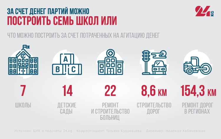 Жогорку Кенеш и так часто критикуют за баснословные траты. Но расходы партий на выборов не менее баснословны. Они уже потратили почти столько же, сколько в год уходит на содержание Жогорку Кенеша. А ведь и без выборов в стране хватает проблем, которые можно было решить, направив имеющиеся у политпартий ресурсы в нужное русло.