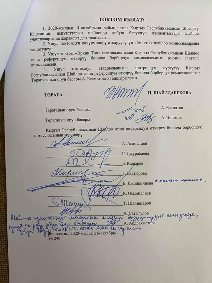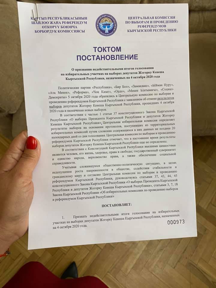 ЦИК приняла решение признать итоги выборов депутатов Жогорку Кенеша, прошедших 4 октября, недействительными. Информацию подтвердила член Центризбиркома Гульнара Джурабаева.