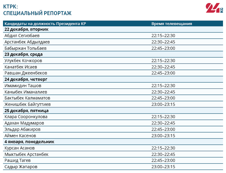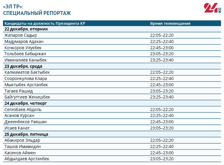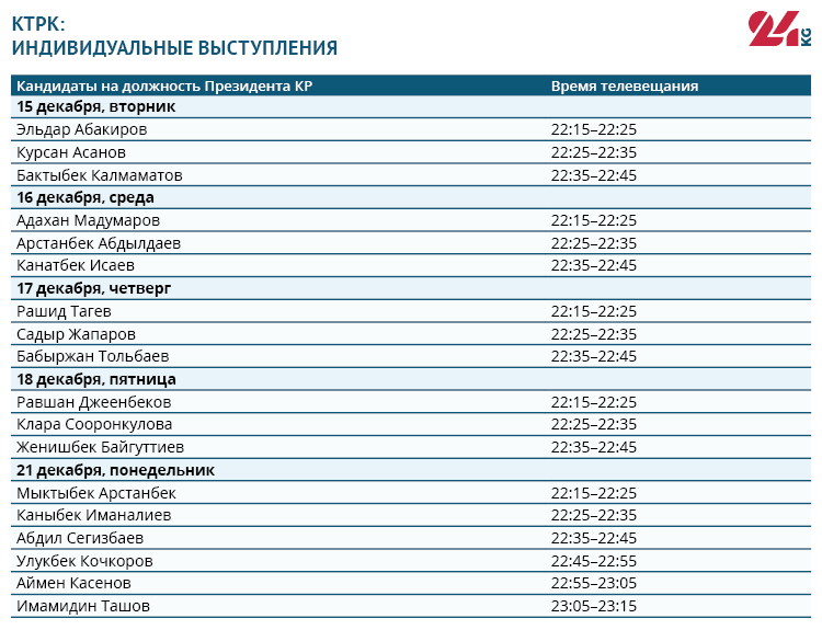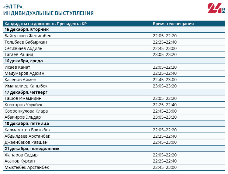 ЦИК уже провела жеребьевку между претендентами по распределению бесплатного эфирного времени и опубликовала расписание как индивидуальных выступлений, так и дебатов, на каналах ОТРК и «ЭлТР».