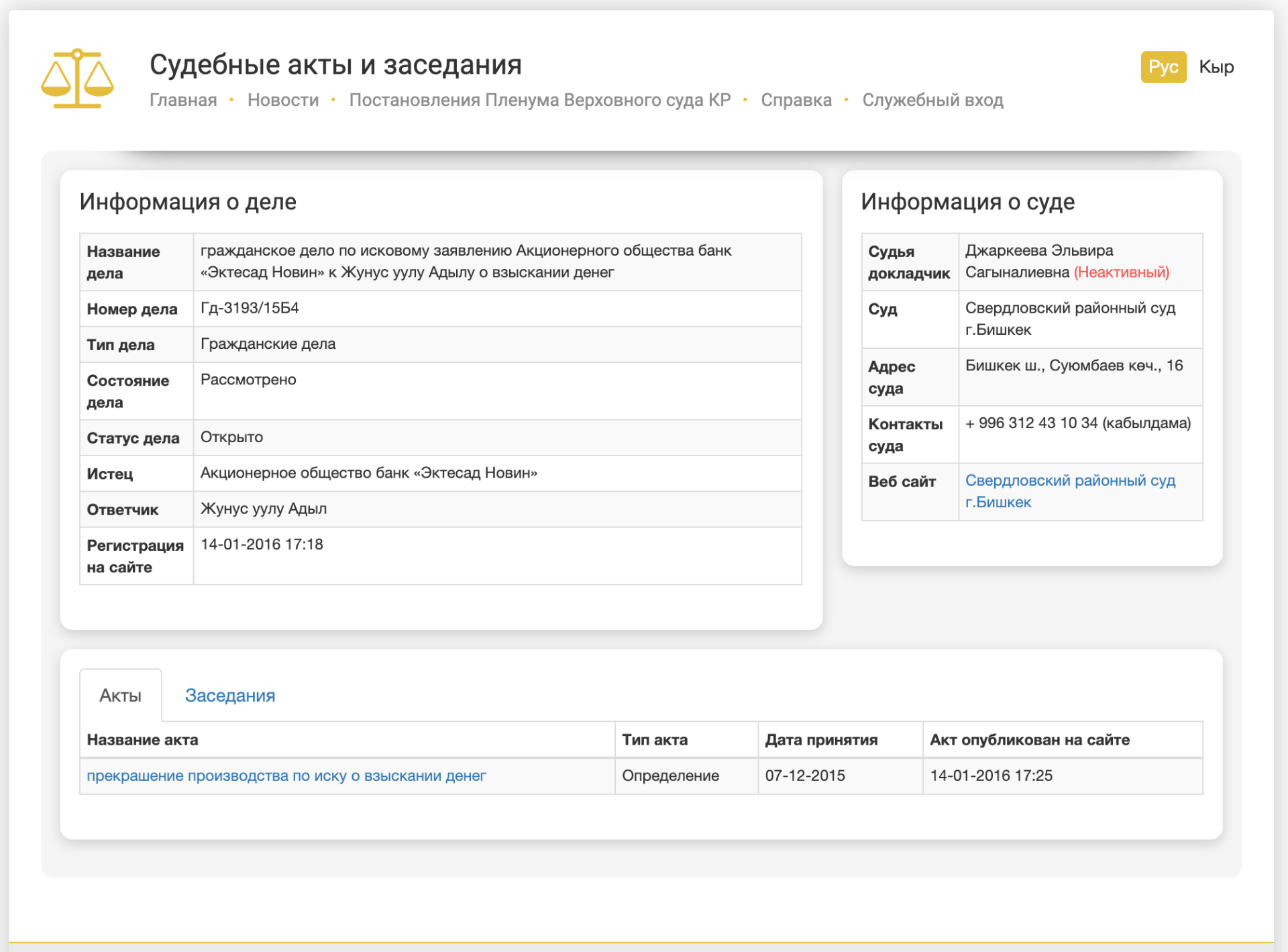 В мае 2012 года Адыл Жунус уулу подал в суд на иранцев. Не уведомив ответчиков по иску, то есть инвесторов, Свердловский районный суд рассмотрел дело заочно, признав все договоры купли-продажи и дополнительные соглашения к ним недействительными. «Таким образом, выплаченные иранской стороной по этим документам $800 тысяч как бы перестали существовать», — говорится в статье.
