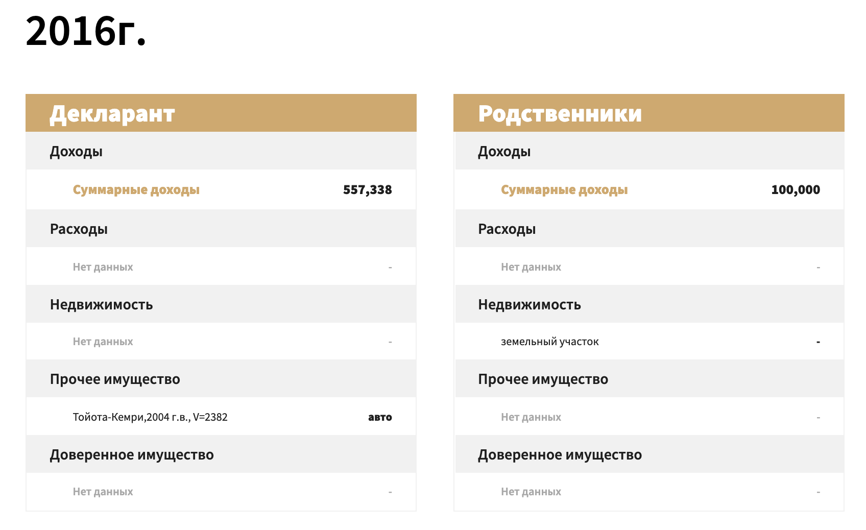 В открытом доступе есть только две декларации чиновника — за 2015 и 2016 годы.