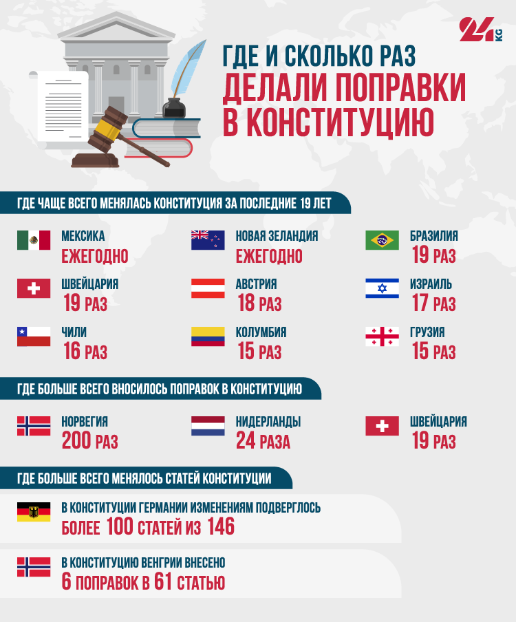 В топ-10 стран, где за последние 20 лет чаще всего менялась Конституция, вошли Мексика, Новая Зеландия, Бразилия, Швейцария, Австрия, Израиль, Чили, Колумбия, Грузия и Индия.