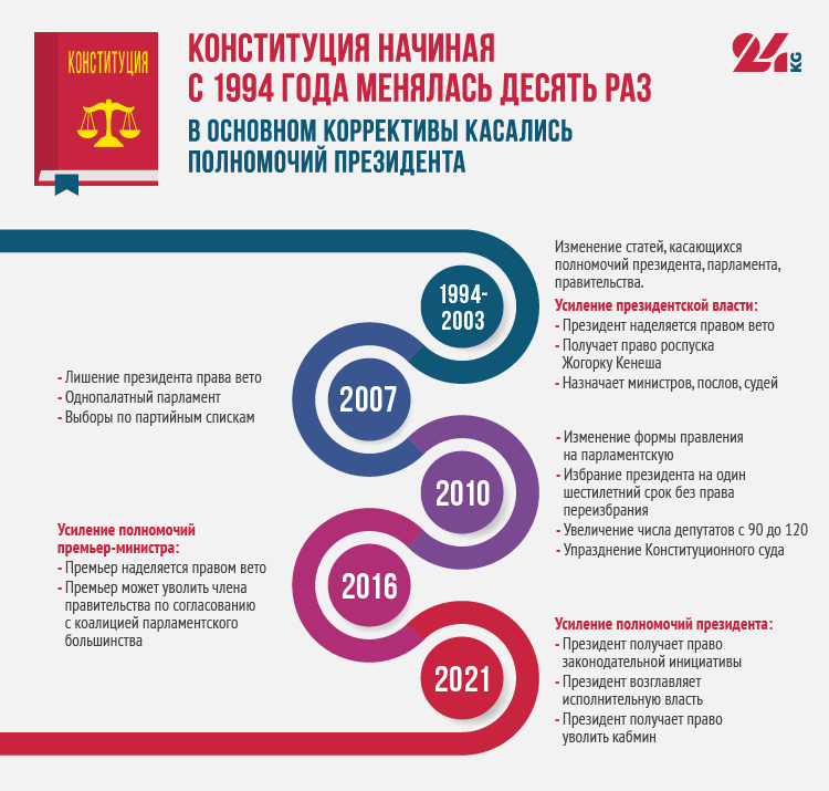 Летом 2016-го в парламент внесли пакет поправок, в частности, расширяющих полномочия премьера. В республике на тот момент действовал мораторий на внесение изменений в Конституцию до 2020 года. Но ни депутатам, ни Алмазбеку Атамбаеву, который был президентом, существующий запрет не помешал. В декабре кыргызстанцы поддержали поправки на референдуме, прошедшем без наблюдения ОБСЕ.